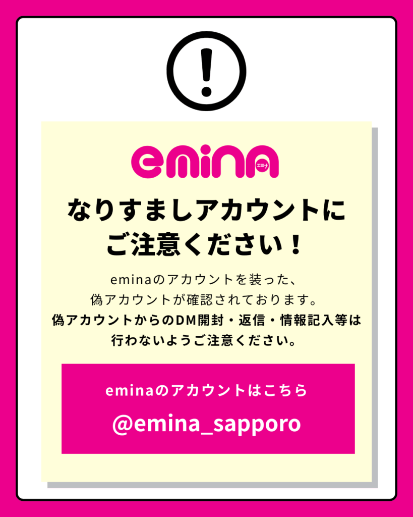 数日前より、Instagramでeminaのインスタアカウントによく似た、「なりすましアカウント」が見つかりました。 会員さまやフォロワーさまからも、なりすましアカウントのご報告をいただいております。 ご心配やご迷惑をお