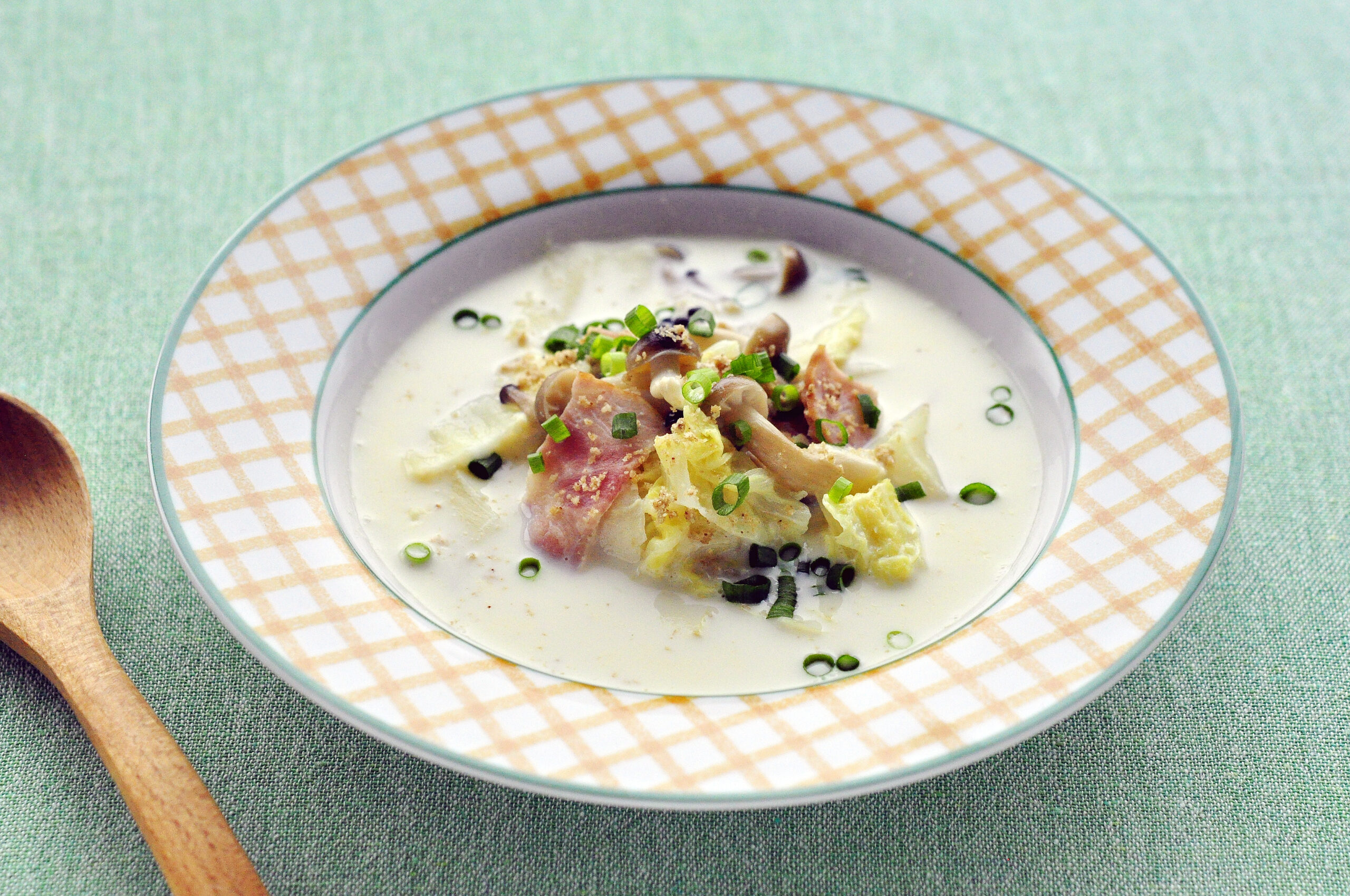 鍋に水を入れ沸騰させ、白菜、しめじ、ベーコンを加えたら華味、みそを加えて味付けします。