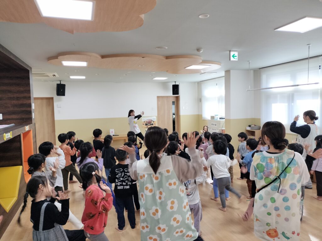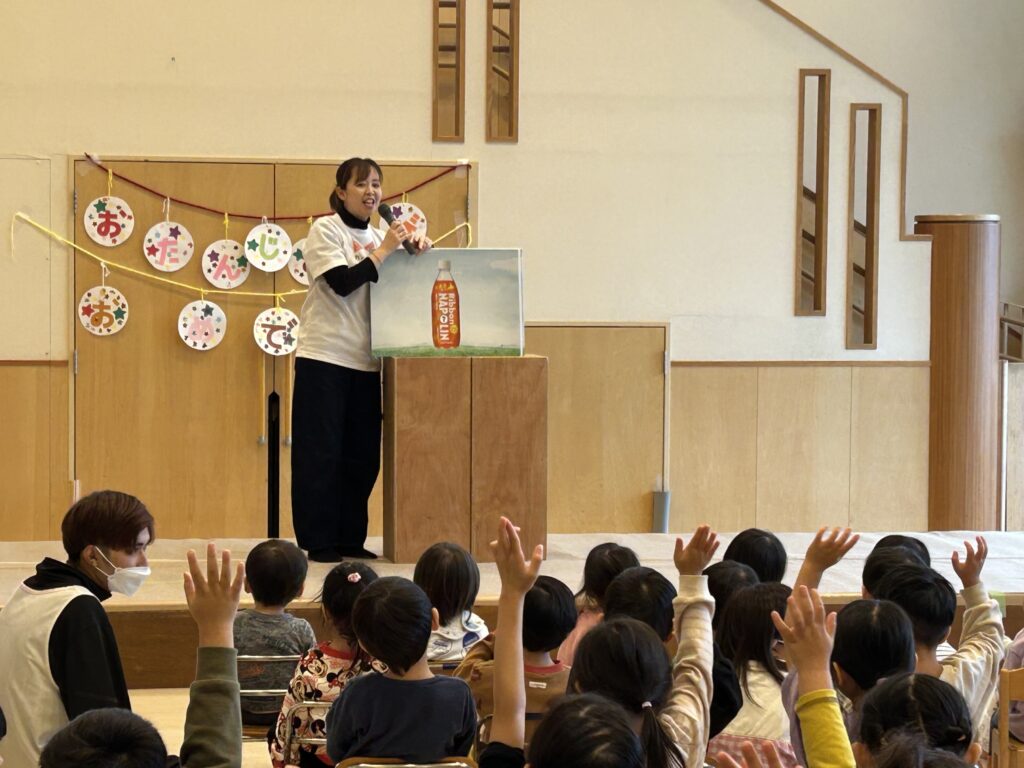 11月に入り、朝晩の寒さも厳しくなり紅葉した葉も落ちて、どんどん冬の訪れを感じますね。 今日はあいの里大藤幼稚園にお邪魔して、年少さんと一緒にミルクキッズ教室を開催しました。 子供たちはホールで、うっしーと一緒に紙芝居を