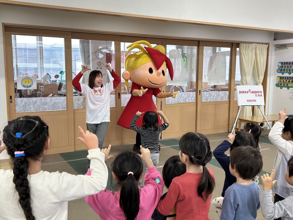 11月も後半に入り、朝晩の冷え込みが厳しくなってきましたね。寒さに負けず元気いっぱいなお友達へ会いに、平和あすみ保育園へリボンちゃんと一緒にお邪魔しました。 ホールに集まってくれたお友達の前に登場したエミナスタッフのちえ