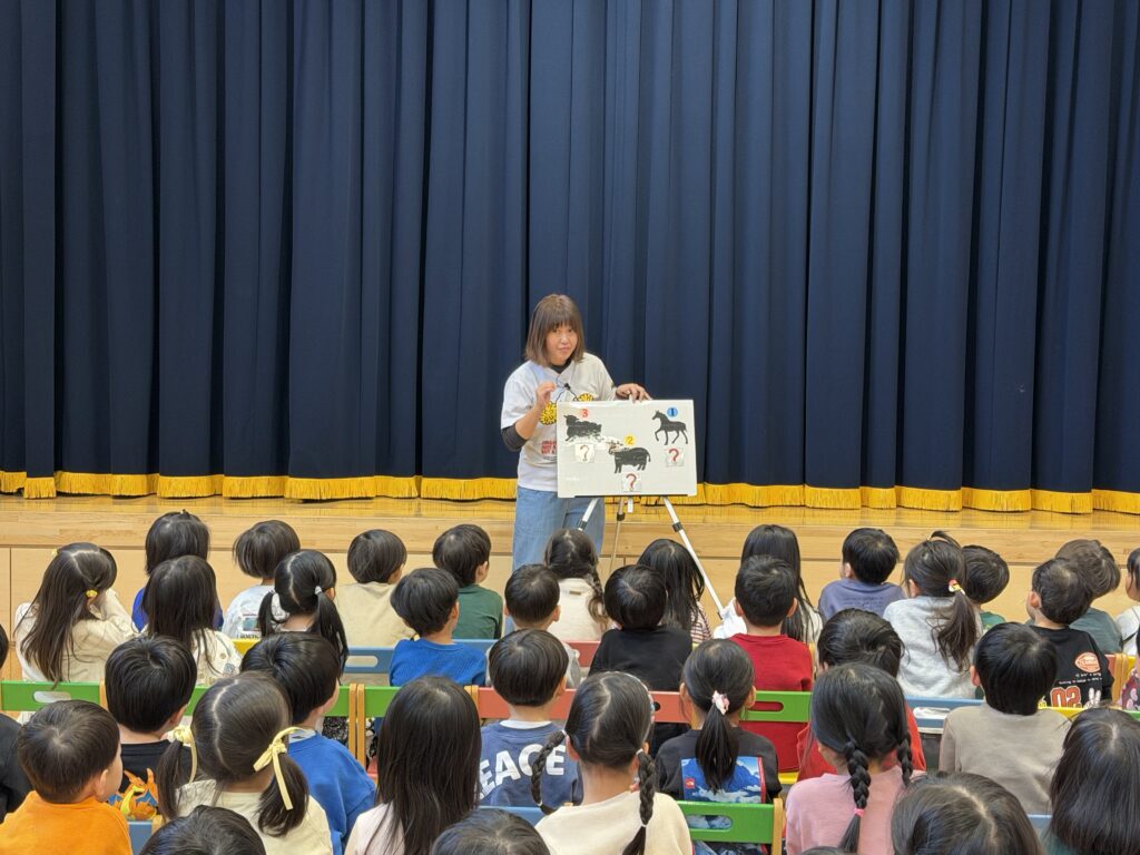北海道が生産量第一位である牛乳についてもっと知っていただきたく、西区にあるあづま幼稚園にお邪魔して年少さんと一緒にミルクキッズ教室を開催しました。 最初に子供達は、ミルクキッズ教室の人気者うっしーと一緒にペープサートを使