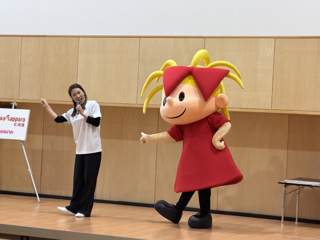 今回のリボンちゃん幼稚園・保育園訪問は、新琴似育英幼稚園のお誕生日会へお邪魔しました。 キラキラした冠をつけた今月お誕生日のお友達が、たくさんのお友達やおうちの方にお祝いしてもらっていましたよ。 そこへエミナスタッフのち