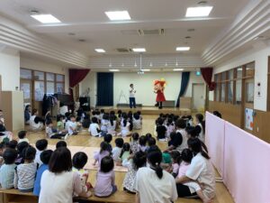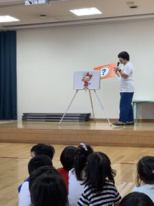 園児さんたち、みんな、誰が来るのか知っているのかな…??リボンナポリンの歴史とともに、今日のゲストは誰なのか?紙芝居を見ながら推理していきます。
