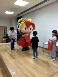 最後はリボンちゃんから、みんなにプレゼントをお渡ししました。中にはリボンナポリン、ポッカレモン100、レモンドリンクオリジナルシェイカー、リボンちゃんハンカチ、レモンのチカラBOOKとリボンちゃんの歴史の冊子が入っています。