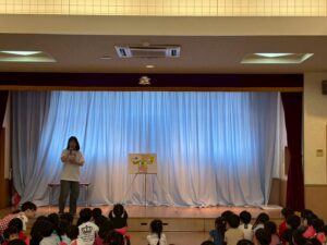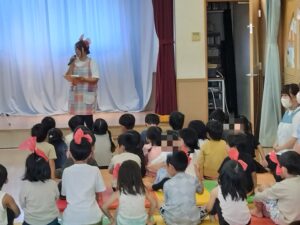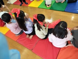 ホールには1歳〜6歳までのお友達がたくさん集まってくれました。赤いリボンを付けてくれたお友達と先生もいましたよ🎀