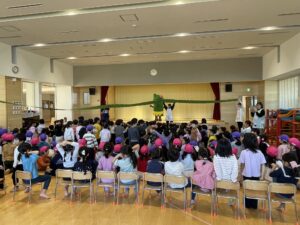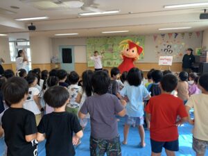 下ごしらえを終えた子供たちがホールに集まり、カレークイズを行った後にエミナスタッフのさおり先生が呼ばれ、さおり先生が一緒に遊びに来た海の仲間たちを紹介していきました。