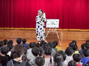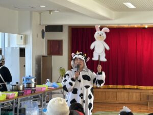 子供たちはホールでうっしーから紙芝居を読んでもらいながら、牛さんの事や牛乳についてお勉強していきました。