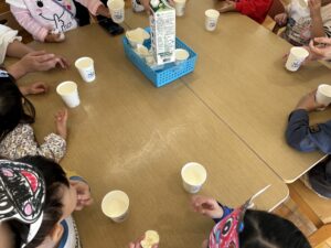 牛乳もたくさん飲んでくれました!おうちではあまり飲まないお友達がゴクゴク飲む姿に驚かれているおうちの方もいらっしゃいましたよ。自分たちで作ったミルク蒸しパンをみんなで一緒に食べると何倍も美味しくなりますよね。