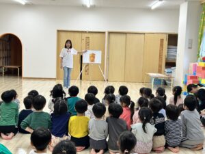 みんなに早く会いたがっていますが、まずはホールでエミナスタッフのゆみ先生から紙芝居でリボンナポリンについてのお話を聞いてもらいました。