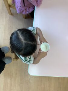 乳アレルギーのお子さまには、蜂蜜レモン水を試飲してもらいました。