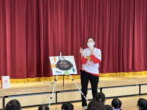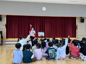 2,3歳児クラスのお友達と一緒に、エミナスタッフのちえこ先生が紙芝居を読みながらジンギスカンについて教えてくれました。