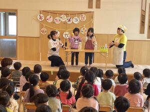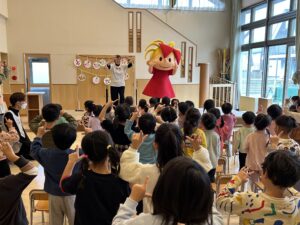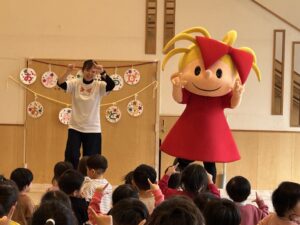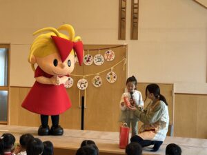先生からの出し物で、保育園の先生がリボンちゃんのお友達の先生ということでエミナスタッフのちづこ先生を紹介してくださいました。