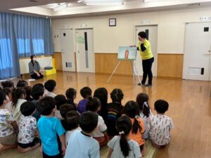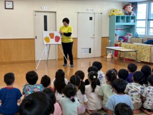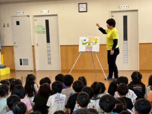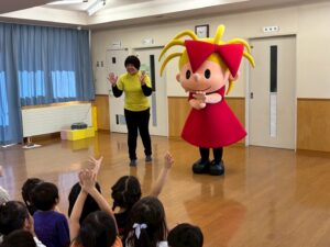 ホールに集まってくれたお友達の前にエミナスタッフのさおり先生が登場し、リボンナポリンのお話をしました。