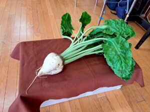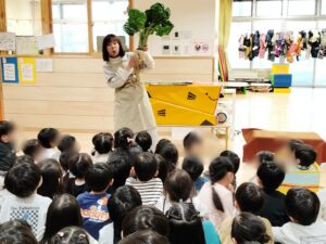 てん菜は大根のような見た目ですが、実はほうれん草の仲間なんです。そのことを知ったお友達はビックリしていましたよ!ゆみ先生がてん菜のレプリカを見せるとお友達から『カブみたい!』という声が聞こえてきました!
