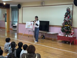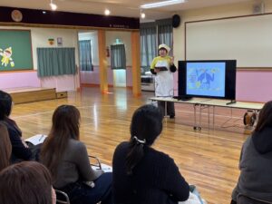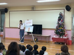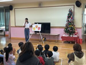 おうちの方のお話が終わると子供たちがホールへ集まり、エミナスタッフのしおり先生がある飲み物のお話をしてくれました。