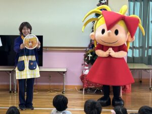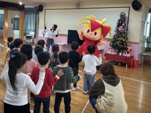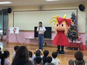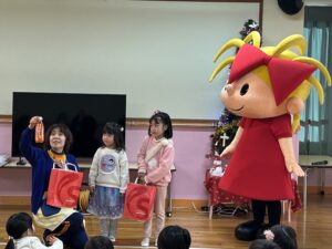 積もった雪に太陽が当たりキラキラ光る晴天の中、リボンちゃんと一緒に琴似中央幼稚園へお邪魔しました。
