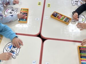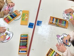 子供たちは紙芝居が終わると、それぞれのお部屋で牛のお面作りを行ないました。
