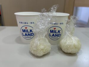 完成したお面をつけて、最後は親子いっしょにミルクライスおにぎりと牛乳を試食していただきました。