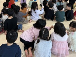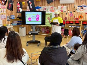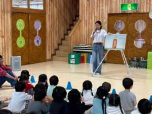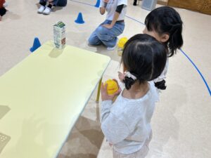その頃子供たちは、ホールでエミナスタッフのしおり先生からリボンナポリンについて教えてもらいました。
