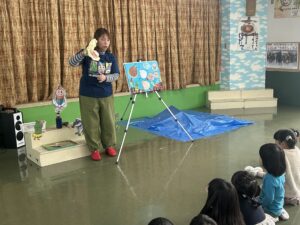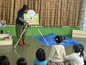 子供たちは保育士のいずみ先生から紙芝居を見ながらほたての事をいろいろ教わりました。