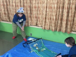話が終わり子供たちの所へ行くと、ちょうどレプリカを使ったほたて漁の説明を行っていました。