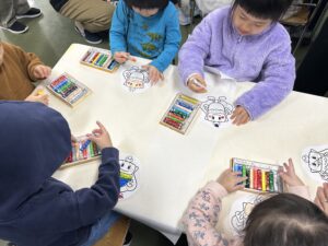 紙芝居で出てきたホタテリオを見て塗ったり、海をイメージして塗ったりと、それぞれ思い思いの色を塗っていきました。