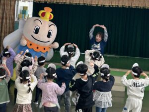 本物の登場にみんな大喜び!ホタテリオの好きな事などいろいろ教えてもらいました。そこでホタテリオの大好きな踊りをみんなにも見てもらい、一緒に踊る事になりました。