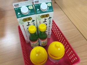 また、ダンスの後にピッタリの飲み物「レモンラッシー」についてしおり先生からお話があり、代表の園児さん2名にお手伝いしてもらい、実際にレモンラッシーを作ってもらいました! 材料の牛乳、ポッカレモン100、オリゴ糖を専用シェーカーに入れてシャカシャカと振るだけ! 全身を使って一生懸命振ってくれて見事完成!! みんなにも試飲してもらい、そのままでは酸っぱくて食べれないレモンもおいしく飲むことができました!