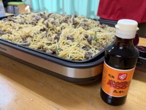 最後は楽しみにしていたラム焼きそばの試食です。みんなが考えた「ジンギスカーン!!」の掛け声で隣のお部屋の扉が開き、エミナスタッフがラム焼きそばを持って登場しました☆