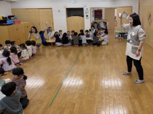 そして紙芝居を読みながら、ジンギスカンのお肉は何の動物のお肉だと思うか3択でクイズを出すと、大きいクラスのお友達はすぐに「羊のお肉~!」と答えてくれました。