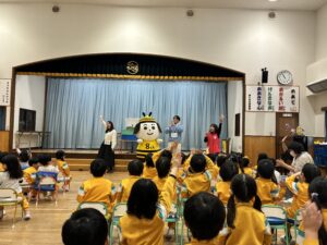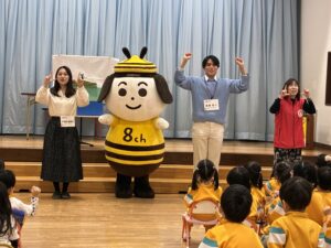 ホールに子どもたちが集まり、みんながワクワクした様子で待つ中、「ちっすー」こと千須和アナウンサー、「このちゃん」こと狐野アナウンサー、そしてみちゅバチが登場しました。