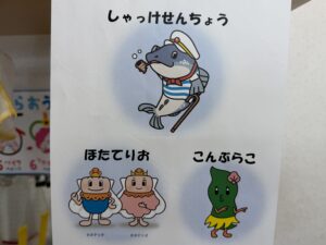 準備をしていると、スタッフが着ていたおさかなキャラクターが描いてあるTシャツを見て「シャッケ船長!」「ホタテリオ!」など名前を言ってくれた子供たち。なんとこの日の為にそれぞれのお部屋でキャラクターの絵と名前を書いて貼ってくださったそうです。ありがとうございます!