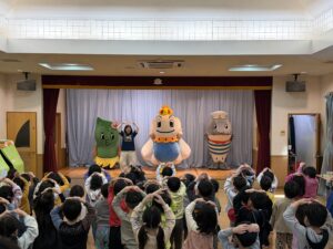 雪解けが進み春の気配を感じるこの頃、北海道のおさかなキャラクターと一緒に北白石こども園へお邪魔しました。