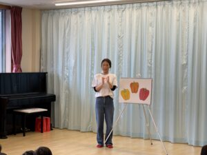そしてリボンナポリンのオレンジ色は何の色だと思うか、ヒントは野菜だよ~と聞いてみると、「みかん?」「にんじん?」という声の中から「パプリカ!」と答えてくれたお友達がいました~大正解☆天然由来のやさしい色なんですよ。