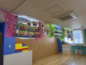 もうすぐゴールデンウィークにこどもの日がやってきますね。園の入口には大きなこいのぼりが、そして会場となるホールには子供たちが作ったこいのぼりが飾られていましたよ。