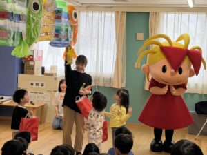 たくさんの手が挙がり「知ってる~!」「ポッカレモン?」という声が聞こえてきました。子供たちはエミナスタッフが後方で準備していたポッカレモン100を見て「これ知ってる!」「CMで見た~!」と話していたので名前がでてきたのかな?ゆみ先生から「リボンナポリン」という名前であることを教えてもらいましたよ。